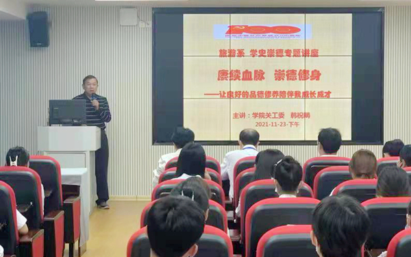 讲座以习近平新时代中国特色社会主义思想为指导,以党史学习教育为契机,结合学习贯彻习近平总书记“七一”重要讲话和党的十九届六中全会精神,从崇德、明德、立德三部分向广大学生作解读和讲解。第一部分国无德不兴,人无德不立,引用“德者,本也;财者,末也”、“礼义廉耻,国之四维”、人生“三不朽”等典故古训,从传统文化、党的教育方针、大学人才培养目标、新时代用人标准等方面,阐述为什么崇德立德;第二部分明大德、守公德、严私德,从历代“修身、齐家、治国、平天下”和社会主义核心价值观国家、社会、个人三个层面,阐明了应该立什么德;第三部分内化于心,外化于行,讲述怎样修德立德。